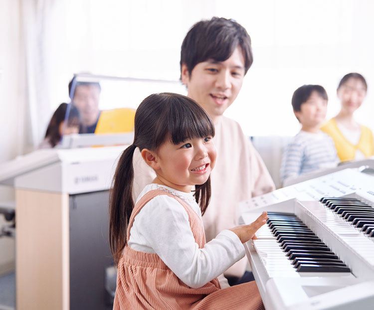 YAMAHA MUSIC SCHOOLの幼児期のレッスンでは、エレクトーンを使用します。まだ指の力が発達していない子どもでも、手の形を整えながら無理のない力で弾くことができるためです。エレクトーンの持つ多彩な音色は、イメージをもって演奏することにつながります。また、音量調節が出来る上下二段の鍵盤は、適切な音量バランスや、メロディーとハーモニーの関係を学ぶことにとても適しています。