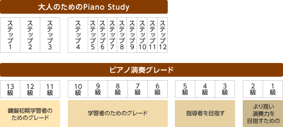 幅広い年齢やレベル層の生徒さんに対応できるよう、ステップ1~12まで全12巻がラインアップ。ヤマハの大人の教材では初めてピアノ演奏グレード13-11級、10-6級(Aコース)に準拠しています。