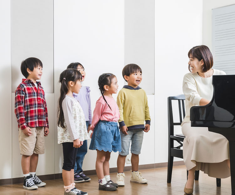 子どもが自然に音楽に親しみ、無理なく吸収していくには、それぞれの子どもの身体的・精神的な発達に応じて、その時期に最もふさわしい教育を受けることが大切であると考えています。特に音楽的聴感覚の発達する幼児期には指導方法として「きく」ことを重視し、楽しみながら音感や基礎的音楽力を身につけさせることで、それ以降、子どもたちは音楽で自分を表現することへの意欲や興味をふくらませていきます。