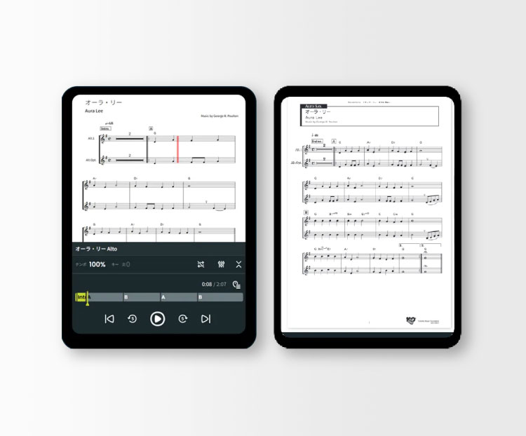 楽譜の閲覧や音源の再生・視聴が可能です。テンポやキーが変えられ楽しく本格的に練習できる音源をはじめ、音源と連動して楽譜が自動で動く「Ugoku楽譜」や、紙の楽譜をめくる感覚でで閲覧できる「Mekuru楽譜」など家出の練習に役立つコンテンツを提供しています。