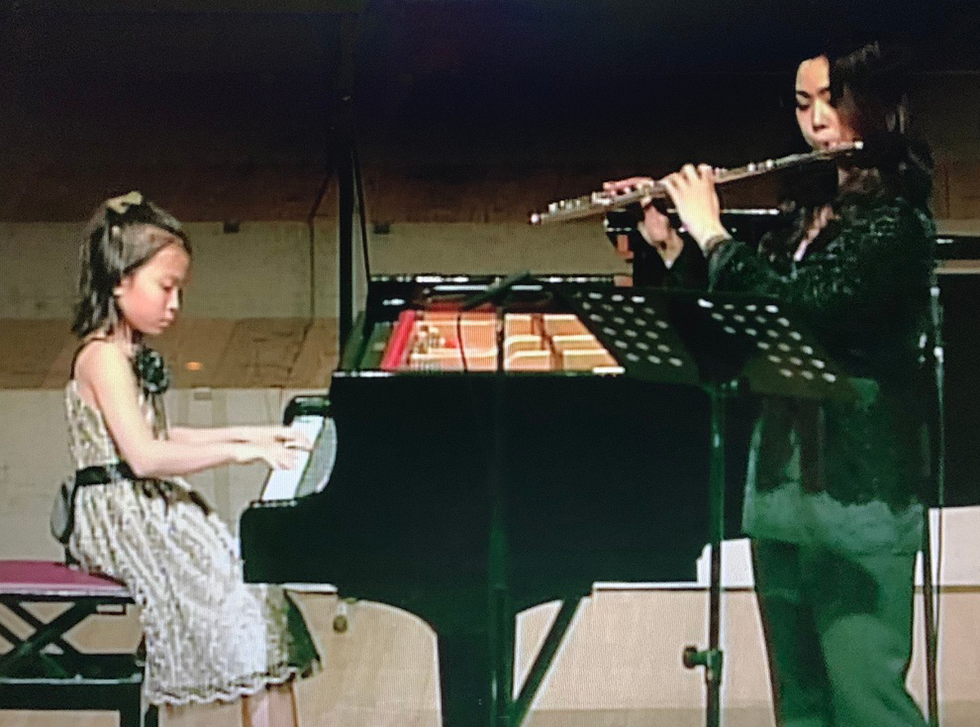 小学4年生の時に出演した「JOC シティコンサート」ではフルートと共演20歳の頃です。JOCやヤマハの音楽教室は高校受験を機にやめていたので、高校時代は軽音楽部などで楽しんでいた程度。大学も一度は英文科に進んだのですが、将来を考えたときにやはり音楽の仕事がやりたいと思い、音大に入り直したんです。音大で教職課程の勉強をし、学童でのアルバイトを経験するなかで、音楽を子どもたちに教える仕事に惹かれていきました。