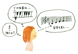 たとえば、4分の4拍子の楽譜で、真ん中の「ド」の音符が1つあったとしますね。普通、音楽家がその音符を見るとき、楽器によって「ド」が楽器上のどの音かというのが違います。ピアノの場合、「“ド”の鍵盤の位置はあそこだな」ということで、それを押せば音が出ますが、どの指で押そうか、どれだけの強さで押そうかということもかかわってきます。最低限これだけたくさんの情報を、瞬時に処理しているんです。