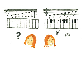 安達:たとえば大ざっぱな例ですが、楽譜上のある音が鍵盤上で真ん中の「ド」より高いか低いかは、腕をどのくらい伸ばすといいかといった運動機能の情報を持っています。先ほど黒鍵のお話をしましたね。ピアノの鍵盤には黒鍵と白鍵で凹凸があるから、音の高さが分かります。「ドレミ」の中に含まれる2つの黒鍵と3つと白鍵を、指の関係で覚えることで、音の高さに対応した実際の指の情報として瞬時に分かるようになる…そんなふうなイメージです。