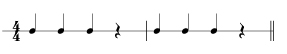 そうでない場合には、(最低限の和声の知識は重要ですが)処方箋的なこととして、旋律と伴奏が単純で、構造がわかりやすい、8小節ぐらいの簡単な楽譜を用いることですね。そして楽譜を読む練習をするだけでなく、パターンを使う活動として、たとえば譜例にあるような4拍子の短い旋律(譜例2)を、リズムなどを変えて、変奏をしていく。このとき、楽譜に書くのではなく、頭の中で変奏して演奏していくようにすると、考えながら弾かなくてはいけないですよね。