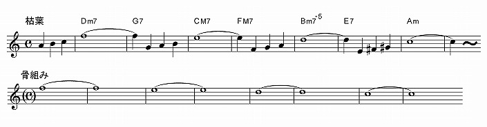 できるだけ簡単な内容で取り組むことから始めるのが効果的です。 たとえば「枯葉」(原題:<仏>Les Feuilles mortes <英>Autumn Leaves/作曲:Joseph Kosma)。あまりにもスタンダードですが、編曲演奏、つまりアドリブと考えると、旋律を細かく修飾することに気を捕らわれがちです。逆の発想をしてみましょう。 譜例1のように、旋律の骨格の音だけを取り出し、単音で(音価やリズム、アゴーギクは工夫する)演奏することから始めます。