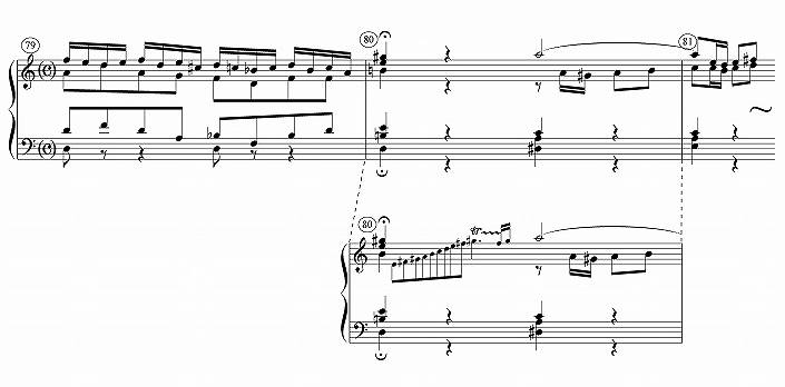 バッハ(J.S.Bach)の作品は、作曲者本人の自筆譜にほとんど指示が無いことから、テンポや装飾音、アーティキュレーションなど演奏者が自ら考えて演奏しなければなりません。このことからある意味では非常に即興的な取り組みができる可能性を秘めています。 ピアニストとして、また数々の即興演奏を行ったことでも有名なグルダ(Friedrich Gulda)は、平均律の演奏においても大胆な解釈に基づく演奏を残しています。そのひとつが即興的に挿入句を入れることです。たとえば1巻20番a-mollのFugaでは、第80小節のフェルマータにおいて譜例2のように挿入句を入れて演奏しています。