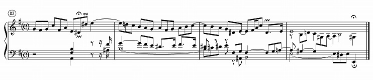 これは、オペラにおけるアリアのレスタティーヴォと同じ発想ですが、古典の時代までは、このような演奏表現は日常茶飯事に行われていました。これを試してみましょう。 たとえば平均律クラヴィア曲集2巻10番e-mollフーガ。終盤第83小節にフェルマータがあります(譜例3)。