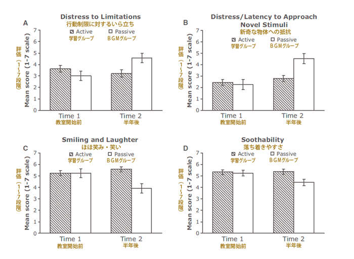 「社会性」については、「新奇なものに対して積極的」、「よく笑う」、「落ち着きやすい」などの評価において、学習グループの赤ちゃんはBGMグループの赤ちゃんよりも高い得点を示しました(図2)。