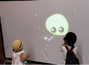 これは音が目に見えたら楽しい、という発想から作ったもので、楽器を鳴らすとその場所から「オトダマくん」というキャラクターが飛び出す仕組みです。これも、子どもたちには楽しい体験になったと思います。
