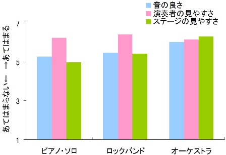 では、観客も、積極的に「見よう・見たい」と思っているのでしょうか? この疑問を探るべく、われわれは、実在のコンサートホールの座席表を使い、座りたい座席とその理由を調査しました※19。音楽専攻生60人と一般学生65人に、クラシックからロックまでいろいろな種類の音楽コンサートを想定して答えてもらいました。そうしたところ、音楽専攻生でも一般学生でも、「演奏者の見やすさ」が、「音の良さ」よりも座席選びの決め手になっていました(図)。この結果は、演奏を見たい意思の強さを示しています。最近のコンサートホールのWebサイトでは、座席からのステージの見え方が載っているところも多くありますが、それも観客の見ることへのニーズに応えたものといえるでしょう。
