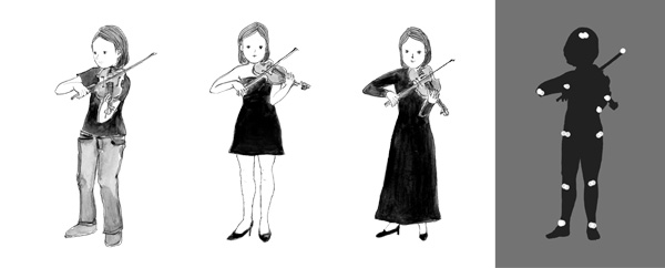 演奏する姿は何を伝えるのでしょうか?この疑問に答えるべく、いろいろな研究が行われています※1。たとえば、反射マーカーの点々で表された身体の動きだけで、演奏表現の大きさが伝わるか調べた研究があります※2。実験では、バイオリニストが、身体の各部の関節に反射マーカーを付け、3通りの表現の大きさ(無表情・通常通り・誇張)で、モーツァルトのバイオリン協奏曲などを演奏しました。鑑賞者は、それを3条件(音だけ・マーカーの映像だけ・音+マーカーの映像)で視聴し、演奏表現の大きさを判断しました。すると、マーカーの映像があるとき、最もうまく表現が区別できていました。つまり、音よりも動きの方が、表現をよく伝えていたのです。