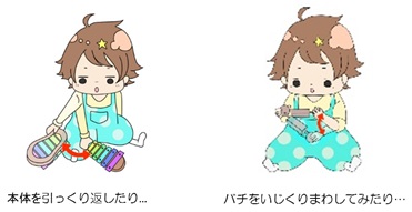そこで、もう少し音楽との接点がイメージしやすい題材を使って考えてみましょう。ヤマハ音楽研究所では、乳児期から幼児期(生後2か月から約4年間)の子どもが母親と一緒に音の出るおもちゃで遊んでいる場面の映像データを細かく分析するという研究を継続しています※5。おもちゃの中には「コンパクトグロッケン」といった“楽器(=音楽的な表現を行うモノ)”も含まれていました。まだ“赤ちゃん”と呼ぶべき時期においては、子どもは当然ながらたどたどしい手つきでそれをいじっています。特にグロッケンという楽器は、鍵盤本体を叩くバチを扱わなければならないため、子どもの行為はおのずと探索的で多様になります(自由度が非常に高いのです)。懸命にお手本を示すお母さんをよそに、子どもは鍵盤本体を引っくり返したり、鍵盤の裏側を触ってみたり、手で叩いてみたり…。バチについても、バチだけを振ってみたり、なめてみたりと、その扱い方は大人の私たちからは「なぜそうなる…?」といいたくなるようなもので、ほかのおもちゃを扱う場合と同じようにいじり倒しているようにしか見えません。