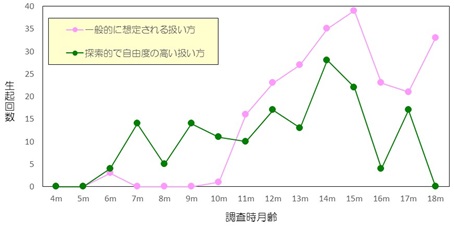 ところが数か月が経過すると、バチが「鍵盤を叩く道具」として扱われるような行動が増え、「音を出すという機能を持ったモノ」としてのかかわりが始まったのではないか、と思わせる変化が見られたのです。図3は、ある1人の赤ちゃんの分析結果の例ですが、調査時の月齢が低いころには「探索的で自由度の高い扱い方(緑色の線)」が起こりやすかったことがわかります。ところが10~11か月齢あたりになると、「一般的に想定される扱い方(ピンク色の線)」が(探索的な扱い方と)入れ替わるように起こりやすくなっていったのです。ほかの赤ちゃんについても、おおむね探索行動を経てから、“ちゃんとした扱い方”になっていくという傾向が見られました※6・7。もちろん個人差はありますし、分析の途上にある部分もありますので、今後も慎重に検討していく必要はあります。ただ、複数の子どもたちが同じような変化を示しているということから考えますと、身体的な探索を通してモノとかかわり、そのかかわり合いの中から「音を出す」というモノに潜む機能を発見し、その機能を積極的に利用し始めることによって、自分にとって魅力ある音を出す事象に(その子ども自身が)なっていくのではないかという仮説は、決して根拠のないものではないと思われるのです。周囲にあふれていた雑多な音や、がむしゃらにモノと戯れる中で起こった音とは異なる「音」や「響き」に出会う-そこに、特定の音を自らの行為で生み出していくという音楽的な表現行動の芽生えのようなものがあるのではないか、私はそのように考えているのです。