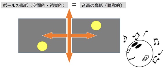 歌をうたうとき、私たちは「キーが“高い”」とか、「“低”音ボイス」といった表現をします。実はここに、音の捉え方の1つの特徴である「空間性」が見て取れるのです。音の高さを表す「高い・低い」という言葉、そうです、これらはたとえば「ボールが“高く”上がった(“低い”方へ転がっていった)」という表現と重なりますね。ボールの高・低は、ある基準から空間のどの程度の高さにボールがあるのかを視覚的に判断したものですが、私たちは音の高さの高・低も同じように把握していると思いませんか?
