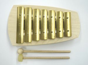 「コンパクトグロッケン」などと呼ばれる金属の鍵盤をバチでたたく楽器では、子どもの月齢が低いうちは、お母さんがいくら隣でお手本を示しても、鍵盤本体を引っくり返したり、鍵盤の裏側を触ってみたり。手でたたいたり、バチだけを振ったり、なめてみたりと自由に遊んでいます。