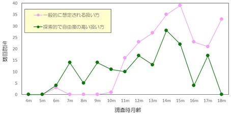 下のグラフは、ある1人の赤ちゃんの例ですが、月齢が低いころは「探索的で自由度の高い扱い方(緑色の線)」が起こりやすかったことがわかります。ところが10~11カ月ごろになると、「一般的に想定される扱い方(ピンク色の線)」が増えています。