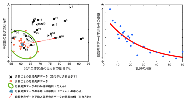 発話の発達において、母語のリズムがいつごろから現れるのかを調べる目的で、日本語で養育されている赤ちゃんの声を毎月収録し、「子音部の長さのゆらぎ」と「発話全体に占める母音の割合」の発達変化を追ってみました。下の左のグラフは、一人の赤ちゃんとそのお母さんの発声について、縦軸に子音部の長さのゆらぎ、横軸に発話全体に占める母音の割合をとったものです。