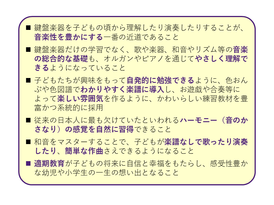 なお、テキストを編纂した松本氏らは、各々の経験から教育者としてハーモニー感覚の習得を重視していました。彼らの目指した音楽教育において、1人で一度に複数の音を鳴らせて、かつ幼児期から使える性質をもつ鍵盤楽器は単純に非常に有効性が高かったのです。音楽教育と会社経営の両方の意図が絶妙なバランスでかみ合ったことも、個人的にはヤマハ音楽教室の一つの奇跡だと思っています。