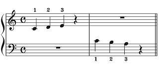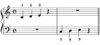 もし習い始めたばかりの子どもが譜例Aのように右手と左手、どちらも「ドレミ」の音型を弾こうすると、右手は親指からで良いけれど左手は小指から弾き始めなければならなくなります。