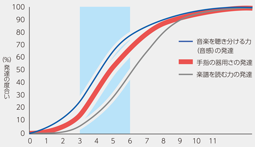 手指の器用さは鍵盤楽器などの演奏能力に直結する能力だと考えられます。発達曲線からはこの能力は3歳頃から7歳頃にかけて急激に発達していくということがわかります。この発達特性を考慮すると、3歳頃から鍵盤に触れ始め、7歳頃までは無理をせず徐々に演奏の難易度を上げながら学習していくということが子どもにとって楽しくストレスのない鍵盤学習の方法だといえるでしょう。
