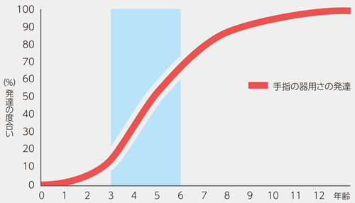 音楽学習に重要な3つの能力の1つが「手指の器用さ」です。鍵盤楽器などを演奏するために必要な能力ですが、「手指の器用さ」はどのように発達するのでしょうか。子どもたちが自然に音楽に親しみ、無理なく吸収していくためにヤマハが大切にしている「適期教育」。ここでは「手指の器用さ」の発達曲線についてエビデンスをひもときます。