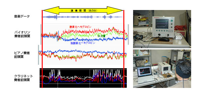 聴取者だけではなく演奏者の血流量測定も、今回の研究では実施されました。さらに、科学と芸術が融合する場面を一般向けに普及させる草の根運動のひとつとして、「光による脳活動計測演奏会」を開催。プロの演奏家を対象とした計測を実施しました。このような研究姿勢や成果が評価され、2007年11月にヤマハ音楽研究所でも計測会を行うに至りました。