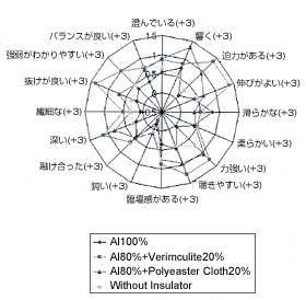 戸田: 何も置かなかったときと創製した材料をインシュレーターとして置いたときの評価の違いは明らかで、「迫力がある」、「伸びがある」、「抜けが良い」、「深い」、「聞きやすい」など、おおむね良い評価が得られました。つまり、今回創製した材料をインシュレーターとして使用した場合、聴感に何らかの変化が生じることが分かりました。