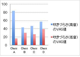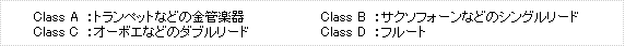 また、この46人の管楽器奏者を、マウスピースやリードの形態によって、(Class A)トランペットなどの金管楽器、(Class B)サクソフォーンなどのシングルリード、(Class C)オーボエなどのダブルリード、(Class D)フルートのそれぞれ4群に分けて比較検討しました。