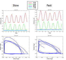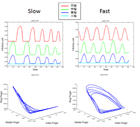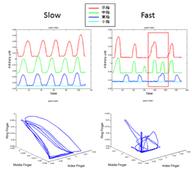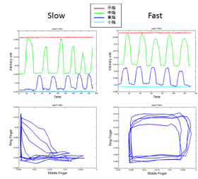 また、複数の指を使ってさらに複雑な動作を行ったとき、テンポが遅いうちは課題動作遂行のための協調関係が成立していても、テンポを速くしていくと動作の協調関係が不安定になり、プレイヤーの意図とは異なる「引き込み」現象も観察されました。