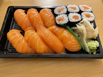 リーズナブルで美味しいお寿司屋さんがあり、コロナ禍で唯一安心してテイクアウトできます。この日は鮭メニュー、ヨーロッパのサーモンはとても美味しいです