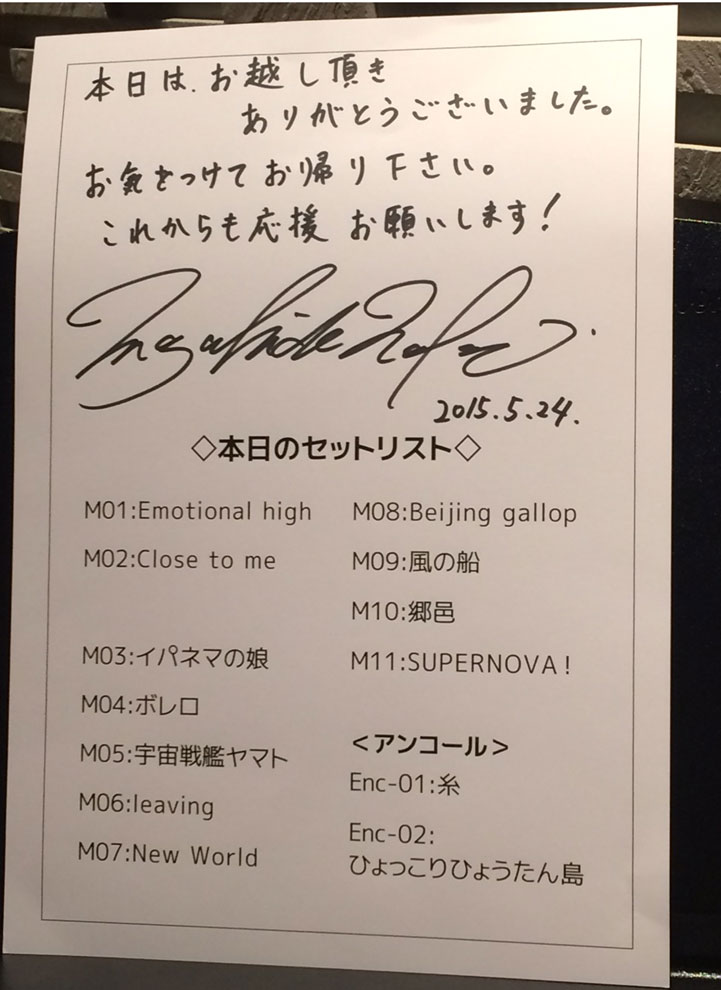 アンコールでは『糸』と『ひょっこりひょうたん島』の2曲を、中野ならではのアレンジで演奏。ライブ全般で時折見せるメンバーとのアイコンタクトや、全身を使って楽しそうに演奏する姿が印象的でした。「ライブが終わって淋しい気持ちもありますが、新しい曲もたくさん書いていきたいです」と、今回のライブでますます自信を深めた様子。今後の活躍が楽しみです。