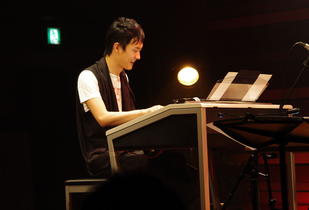 ダンサブルな曲調から一転して『leaving』『New World』の2曲では、エレクトーンならではの多彩な音色をフルに生かし、全身で歌うように弾く姿が印象的。『New World』はこのコンサートのために書き下ろした新曲で、「30歳になり、改めて音楽を楽しみたい」と語る中野本人とも重なり、新しい世界、初めてみる景色、ワクワクする気持ちや期待感などのテーマが見事に表現されていました。8曲目の『Beijing gallop』からは再びギターとドラムが加わり、北京(中国)の力強さや高層ビル、観光客など都会の喧騒を表現する一方、歴史を感じさせる伝統的な風景などもイメージしたオリジナル曲。続く『風の船』では、福井健太氏が参加。風船をイメージしたというこの曲は、昔ながらの情景が浮かぶやさしい曲で、この日の観客からも特に好評を得ていました。ラスト2曲は再びフルメンバーでの演奏で、『郷邑(きょうゆう)』と新曲の『SUPERNOVA !』を披露しました。