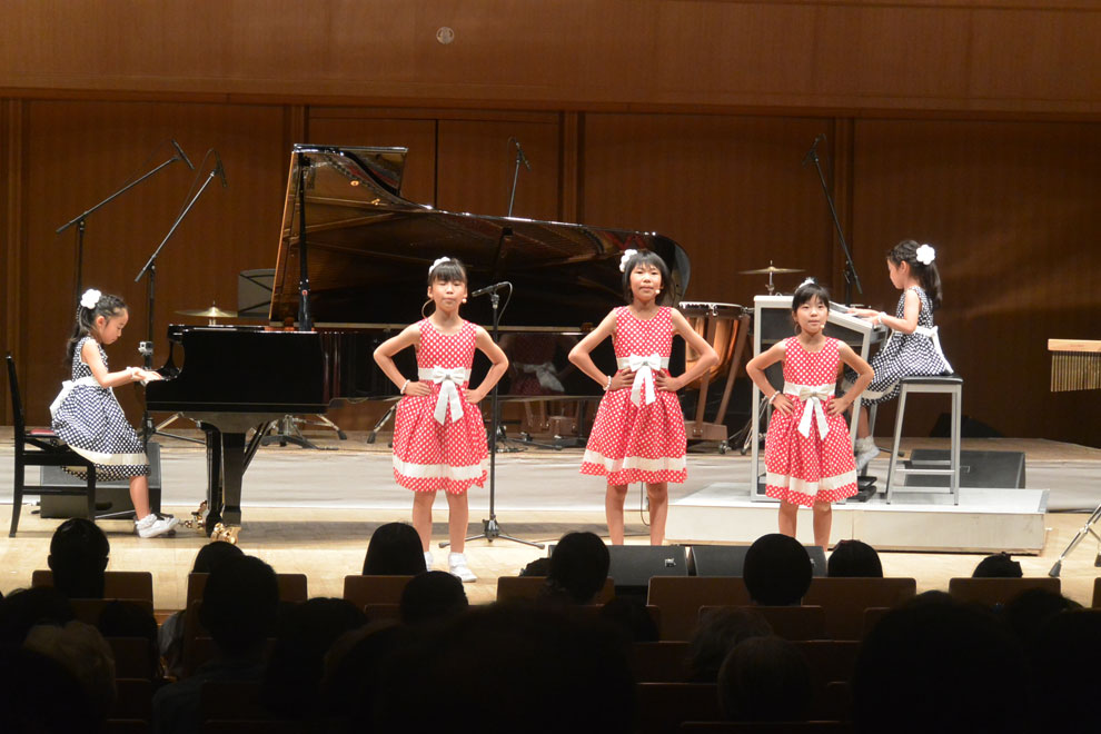 オープニングは、ピアノ・鍋倉 帆奈(なべくら はんな)さん、エレクトーン・村瀬 珠己(むらせ たまき)さん、3人のうた・落合 琴美(おちあい ことみ)さん、酒井 虹歌(さかい にじか)さん、福田 紗菜(ふくだ すずな)さんによるアンサンブル。5人がお揃いの水玉の衣装で登場しました。友達と学校や公園で遊んでいる様子を思いながら創ったという作品からは、5人の仲の良い様子が伝わってきて、可愛らしい振り付けもあり、場内を和ませました。