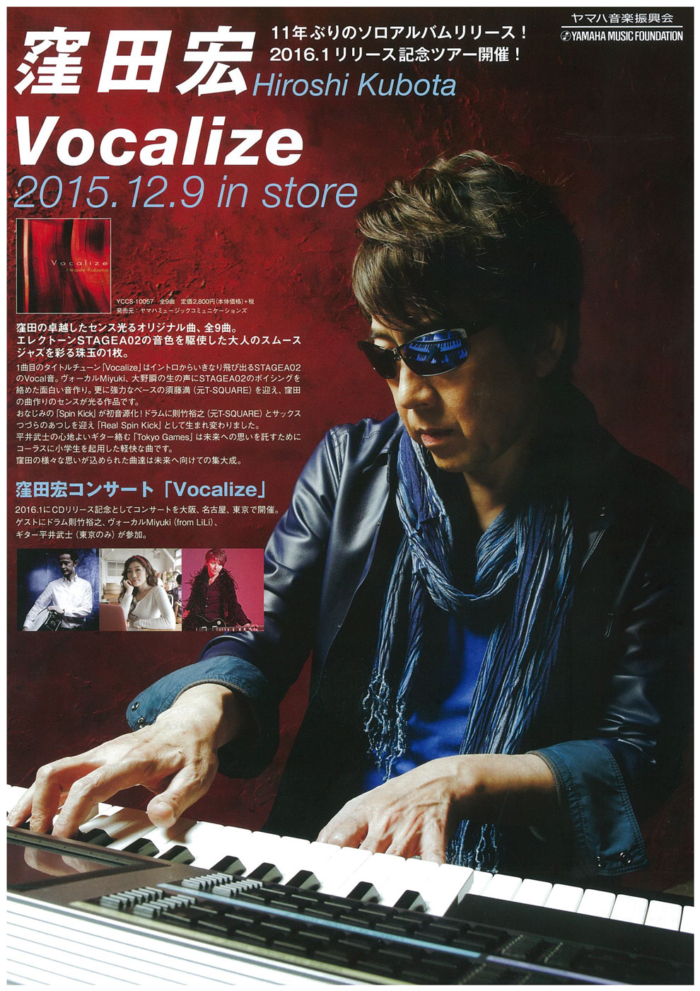 2016年1月に『Vocalize』と題して大阪、名古屋、東京で開催します。レコーディングに参加してくれたドラムの則竹裕之さん、ボーカルのMiyukiさん、ギターの平井武士(東京のみ)さんと共演しますので、とても楽しいライブになると思います。せっかくのライブなんだから、CDとはまた違った表現がしたいと思って今から構想を練っています。あらかじめCDを聴いてきてもらえると、レコーディングとライブとの違いなども楽しめるのでは、と思います。みなさんとコンサート会場でお会いするのを楽しみにしています。