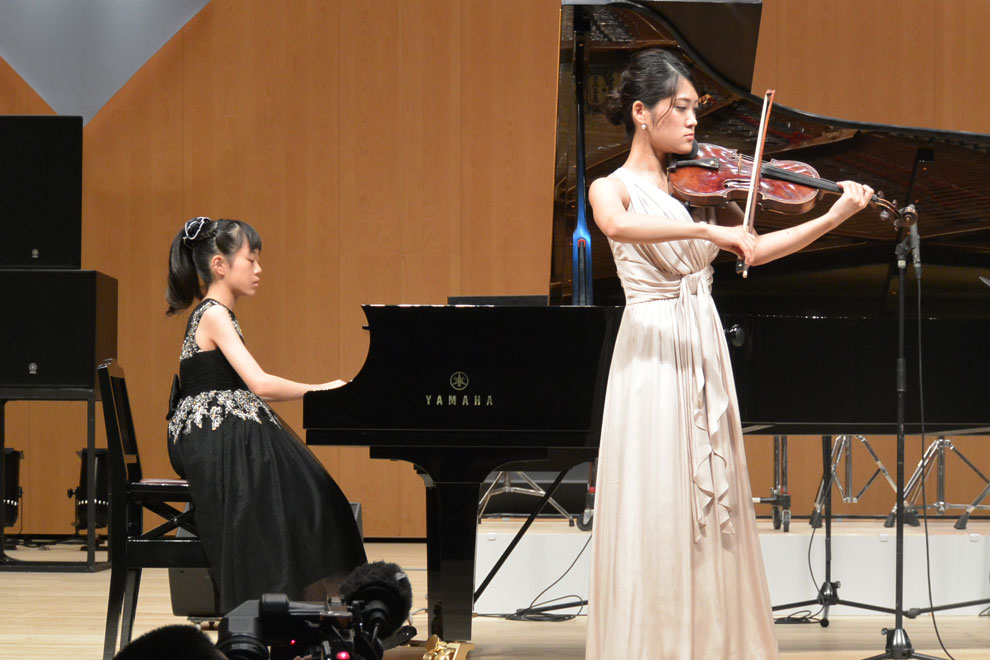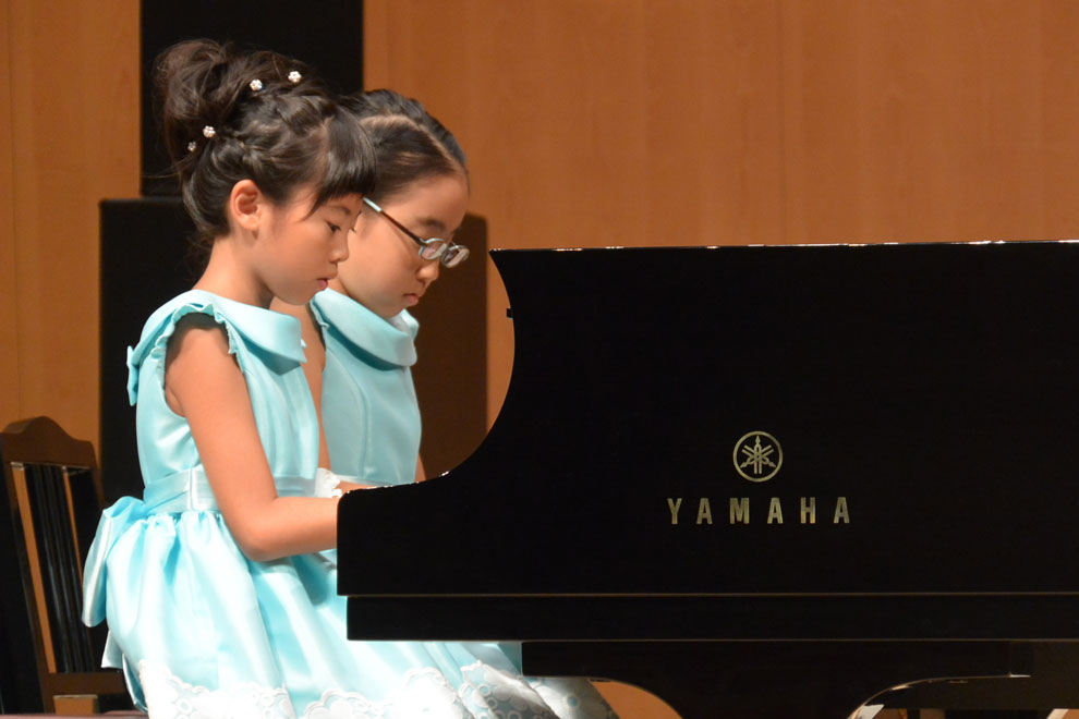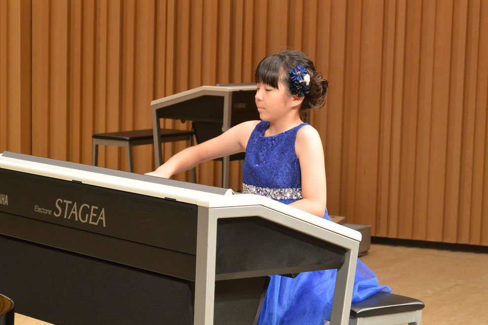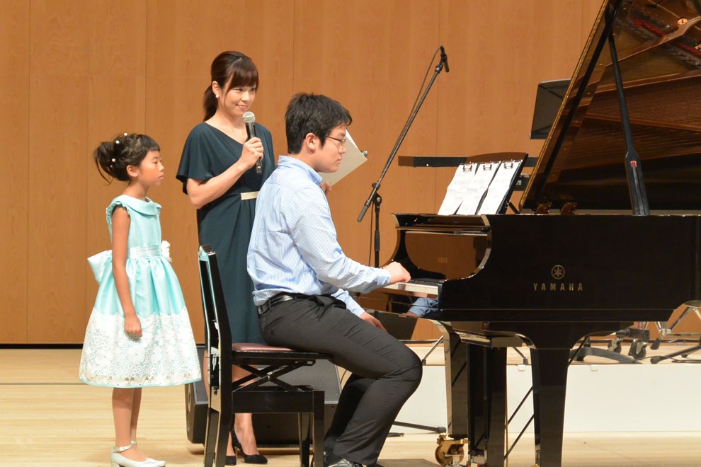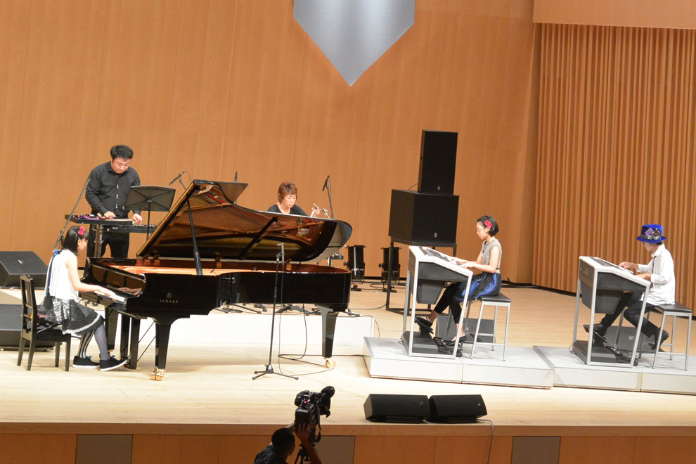 第2部の冒頭は即興演奏。当日開演前のロビーで、来場した子どもたちから寄せられた短いメロディーの中から、清水真菜(しみず まな)さん、島田大敬(しまだ ひろのり)さんがステージ上で1つのメロディーを選び、それぞれピアノ、エレクトーンで即興演奏を披露しました。奇しくも2人とも同じメロディーを選択しましたが、それぞれに違う広がりを持つ演奏に、会場からは大きな拍手が贈られました。