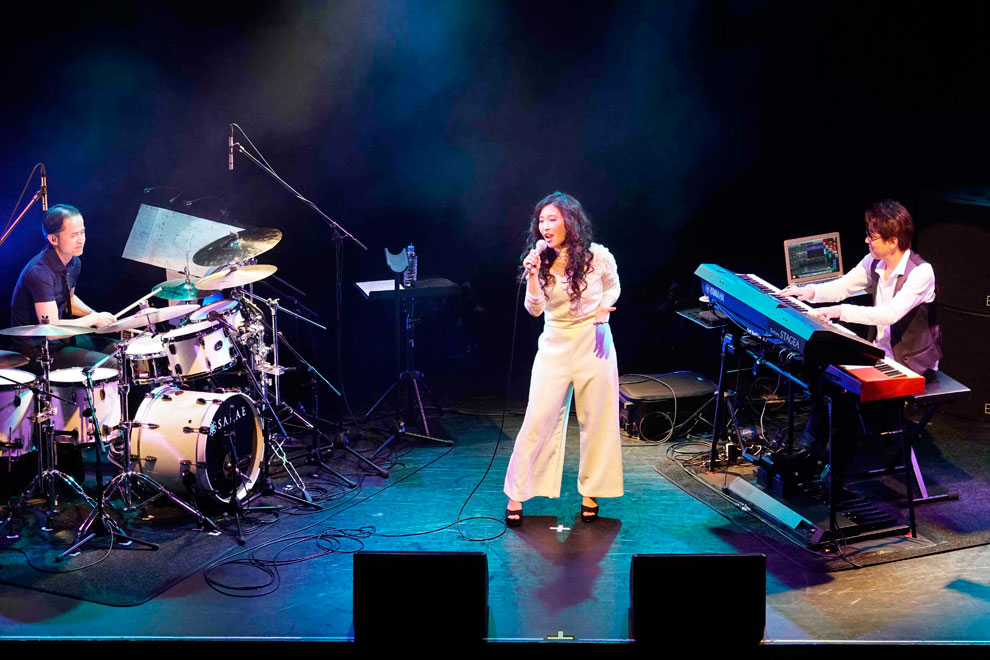 再び3人がそろった『Chance!』。ボーカルにもエフェクトをかけ、EDM系のグルーヴたっぷりのプレイに観客も我慢しきれず手拍子で参戦。間髪入れずに『Kool Tune』が始まり、Miyukiのスキャットと対抗するように窪田のアドリブも攻め続ける。