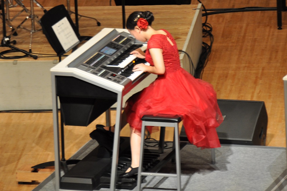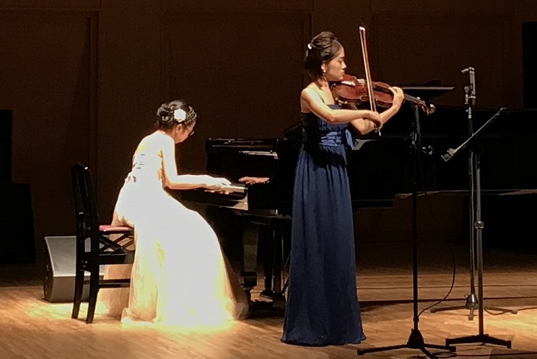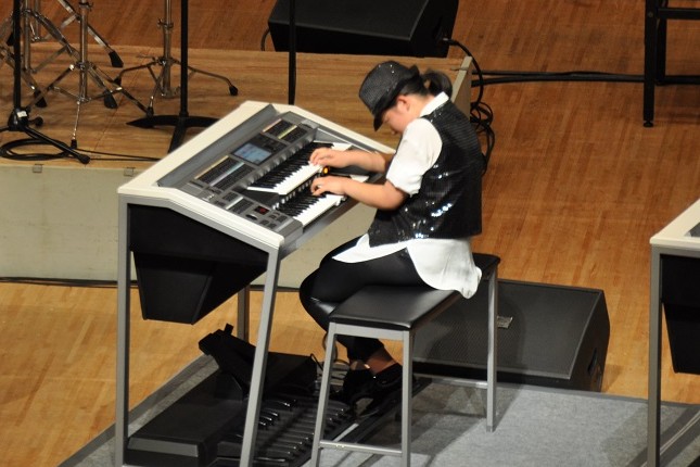 暗闇から少しずつ光が見えてくる様子を不思議な旋律で表現した『Dawn ~始まりの時~』を演奏した岡垣野乃花さん(おかがき ののか、15才 写真右)※エレクトーン共演/岡垣桃奈さん(おかがき ももな、17才)