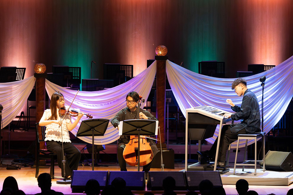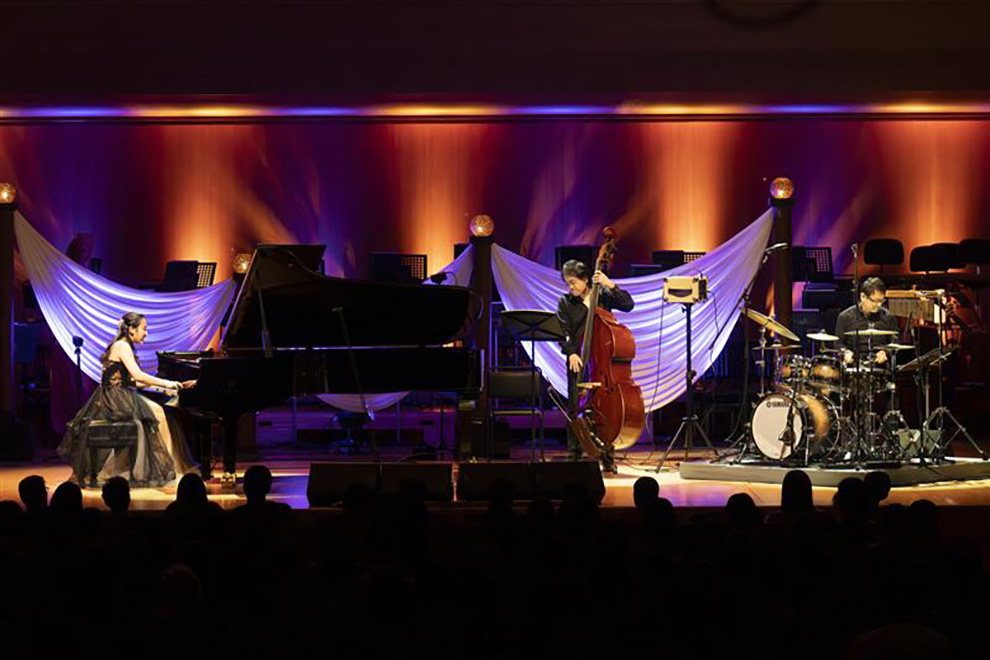 今年は本編の前にヤマハエレクトーンコンクールなどで活躍し、現在エレクトーンデモンストレーターとして活動する山﨑雅也さんがこのコンサートのために書き下ろしたオープニング曲「Stories」が披露されました。ヤマハの音楽教室で学び今に至るストーリーをテーマに、バイオリン、チェロ、エレクトーンによるアンサンブルで表現。さわやかなフュージョンタッチの楽曲がコンサートの幕開けを華やかに飾りました。