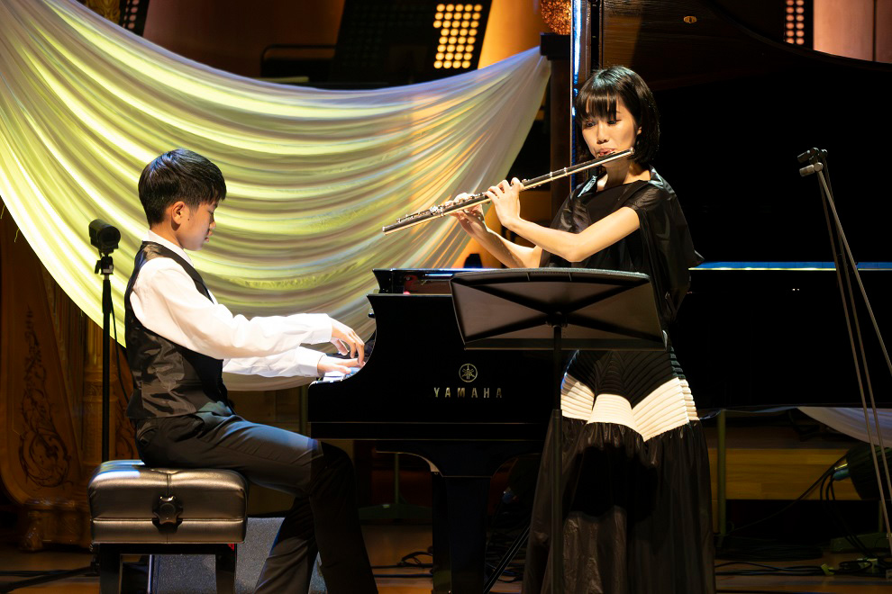 続いて登場した小林蒼太郎(こばやしそうたろう・13歳)さんは、ピアノとフルートのための作品を演奏。念願だったというフルートとの共演で、フランス的なエスプリを意識したオシャレな組曲『フルートとピアノのための幻想曲』を奏でました。『メランコリック』と『スケルツァンド』の2曲からなり、『スケルツァンド』は変拍子で、フルートの音色を惹き立てるメロディが軽やかに響きました。