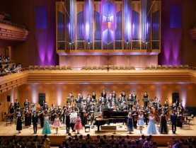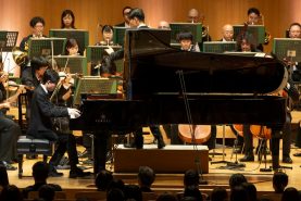 休憩を挟んで第2部は東京交響楽団(指揮:角田鋼亮さん)との共演で、ステージにはオーケストラがスタンバイ。ピアノで共演したのは西野秀一(にしのしゅういち・16歳)さんで、演奏曲はJOC参加作品の『新幹線~with your Heart~』です。新幹線の走っている姿やホームに滑り込んでくるかっこいい様子を音楽で表現し、未来へ向かって軽やかに走り抜けていくようなポジティブ感あふれる楽曲でした。緊張した様子も見せながらも、オーケストラを率いたソリストとしてしっかり務め、客席からは大きな拍手が送られました。