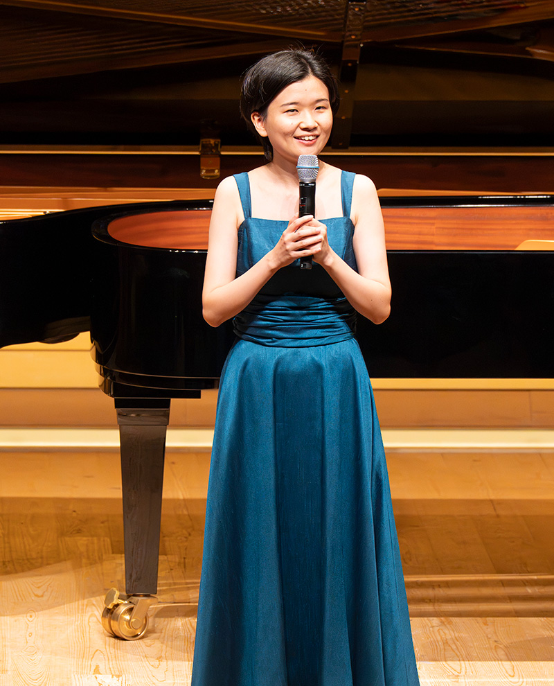 「小さい頃は空手や書道などたくさん習い事をしていてピアノもそのひとつでした。その中で、一番やめたくないと思ったピアノの道に進むことを決心しました。2020年にハンガリー政府奨学生として留学しリスト音楽院修士課程、ソリスト・ディプロマ課程、室内楽課程を卒業後、日本に帰国して現在は国内で活動しています。日本国内でも、ソリストとしての活動以外にも他の楽器との共演や新曲の初演に引き続き取り組みたいです。それから本格的に指導にも挑戦してみたいです」