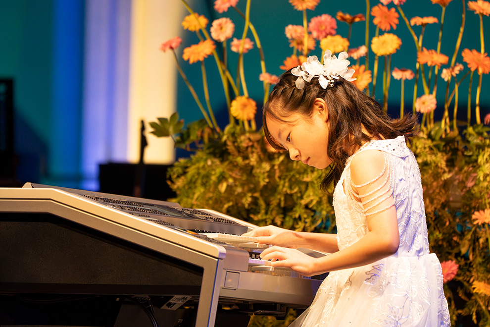 YEF2024 小学生高学年部門第1位受賞者である横塚悠季人さん(13歳)は、受賞曲である吹奏楽の大曲、阿部勇一さん作曲の『交響詩「天地創造」』をエレクトーン・ソロで演奏。荘厳な世界観を、1音ずつ大切に紡ぎ作り上げました。気迫ある演奏は多くの観客を惹き付けます。