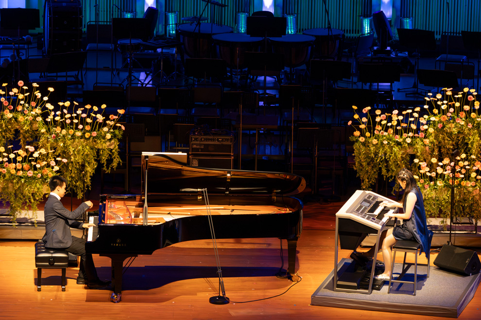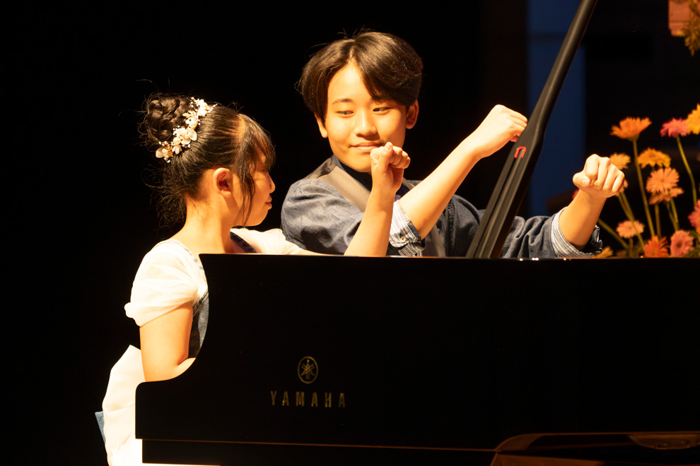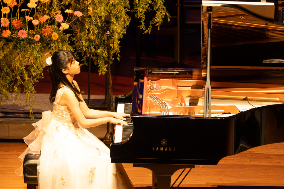次は海外からの参加者の演奏です。ヤマハで学ぶ生徒は全世界で約44万人。ピアノのマイケル・イーサン・フーさん(15歳)は、インドネシア共和国からガラ・コンサートのために来日しました。エレクトーンのスフェトゥラナ・フリツスィ・オンさん(15歳)とのデュオで、コンチェルト風の『Embracing Memories』を演奏。さまざまな風景が展開される、映画を凝縮したようなドラマチックな楽曲で、パフォーマンス性ある演奏スタイルでも惹き付けました。