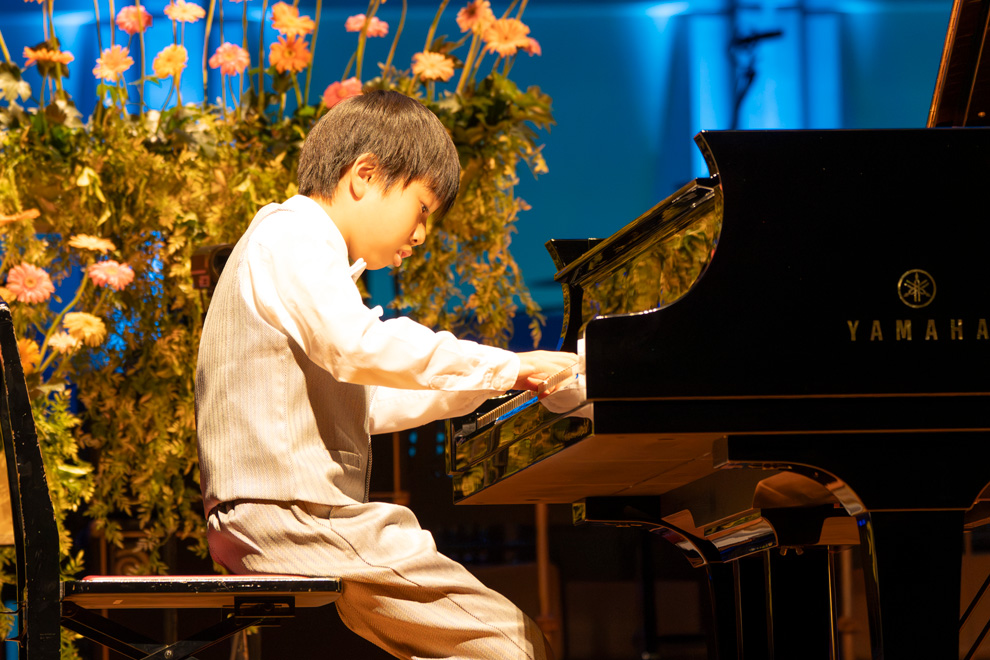 続いて登場した菅原悠心さん(11歳)は、昨年行われた第9回YJPC ジュニア部門(B部門)の第1位受賞者。今回のコンサートではハイドンの『ソナタ ロ短調 Hob.ⅩⅥ-32 第1楽章』、プロコフィエフの『10の小品 作品12より 第7曲「前奏曲(ハープ)」』の2曲を演奏しました。凛々しく端正なハイドンと、ガラッと雰囲気を変えた華やかなプロコフィエフと、幅のある表現力で観客を感嘆させました。
