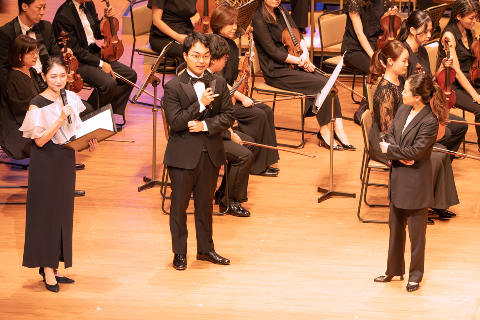コンサートの最後のプログラムは、ヤマハ音楽教室の卒業生でヤマハマスタークラス出身の小林海都さんが登場です。演奏の前に、小林さんと、同じく卒業生である指揮者の三ツ橋さんも交えてのトークタイムが設けられました。小林さんは「発表会で、エレクトーンで『弦楽セレナード』を弾いたことは良い経験。大変なことがあっても音楽が救ってくれるので、皆さんにもぜひ続けていってほしい」とメッセージ。三ツ橋さんも「エレクトーンを通してオーケストラに触れたことが、興味の第一歩に。音楽に触れていた経験はずっと寄り添ってくれるので、味わうことを忘れずにいてほしい」と話してくれました。