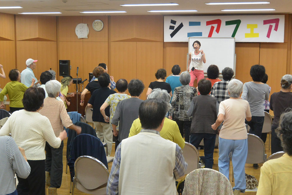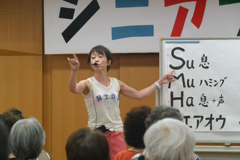 瀬戸講師の誘導で、脚の筋肉を使った簡単なトレーニングやストレッチなど、参加者個々が無理なく楽しみながら参加しました。普段あまり意識することのない顔の表情筋や、唇、舌を大きく動かすトレーニングの後、最後は参加者全員による「オオブレネリ」の大合唱で、60分のプログラムが終了しました。