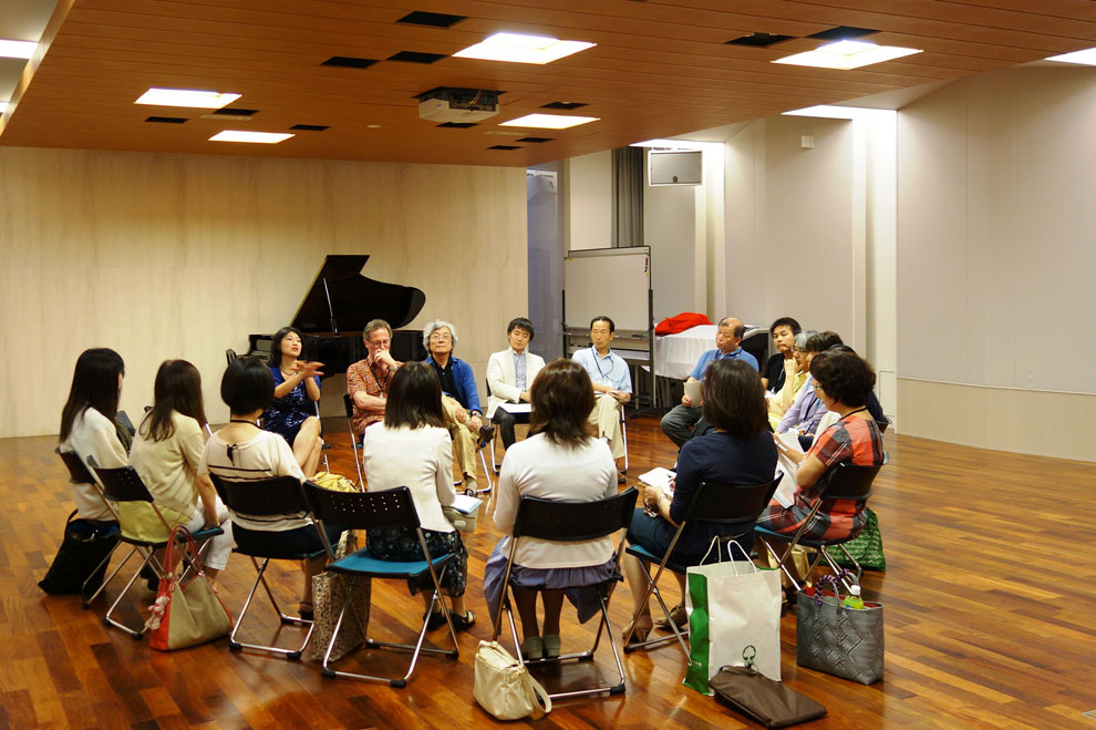 全国から選抜されたピアノ演奏研究コースの仲間が一堂に集い、参加者全員が、ラルフ・ナットケンパー氏(ハンブルグ音楽大学教授)と今峰由香氏(ミュンヘン国立音楽大学教授)によるピアノ個人レッスンを2日間集中的に受講しました。少人数グループの公開レッスンでは、演奏法のみならず、各作曲家による演奏表現の違いやイメージの持ち方などのアドバイスがあり、音楽を深く学ぶ機会となりました。また合宿2日目には、鈴木弘尚氏によるピアノ演奏講座が行われ、全員が前もって準備してきたショパンのノクターンを使用し、ペダルの使い方や楽譜のエディションによる違いなどを勉強しました。レッスン後には、普段のレッスンの指導に携わっている担当講師の先生方と教授陣により、今後のピアノ演奏指導についての議論が交わされました。