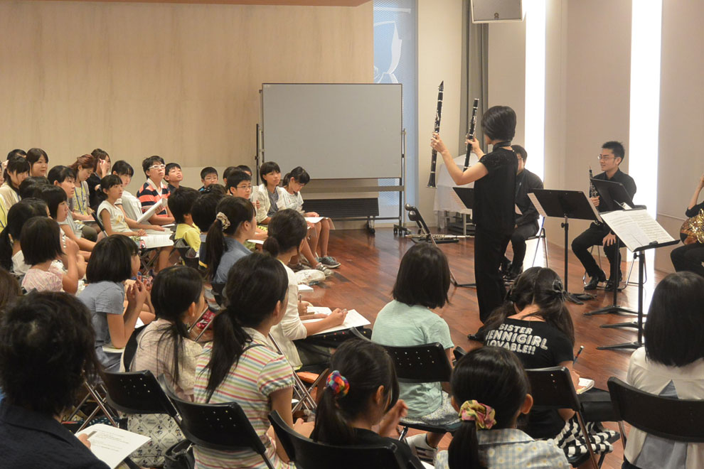 2日目午後からは、鳥居達子氏、名田綾子氏による「即興演奏レッスン」。広原かおり氏、松内愛氏による「アンアンブルレッスン」が行われました。「アンサンブルレッスン」では、子どもたちが6名ずつのグループに分かれ、プロの奏者とのアンサンブル体験を通し、呼吸やタイミングなどアンサンブルならではの要素を学びました。3日目は西岡瞳氏による「創作講座」が行われ、楽曲の構成「3部形式」について演奏を交えながら分かりやすく解説されました。