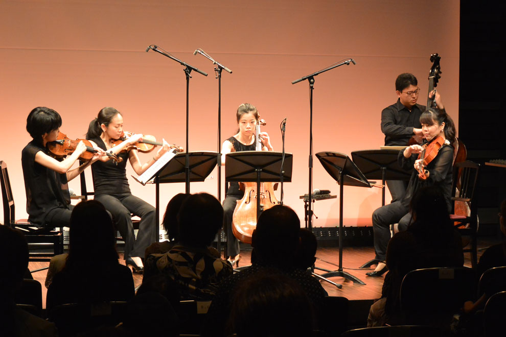 プロの弦楽器奏者5名による、ヴァイオリン・ビオラ・チェロ・コントラバスについての解説とコンサート。弦楽器の仕組みや歴史、それぞれの楽器の大きさや音域の比較、様々な奏法などの紹介と、それぞれの楽器の特色がよくわかるソロ曲や、様々な形態のアンサンブル曲が次々に演奏されました。子どもたちにとってはエレクトーンの音色やオーケストラなどでなじみのある弦楽器ですが、目の前で生演奏を聴くことができる貴重な場となりました。