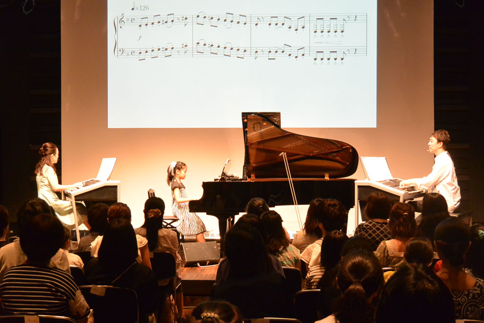 JOCのピアノソロ曲を、エレクトーン奏者・指導者として活躍の加曽利康之氏と鳥居達子氏がその場でアレンジし、2台のエレクトーンによるアンサンブル曲へと変身させていきました。楽譜をスクリーンに映し出し「ここはオーケストラ風に」「ここはボサノヴァにしてみましょうか」など、2人の様々なアイデアによって曲が変わっていく様子に、会場の子どもたちも興味津々の様子。2人の息のあったやりとりで会場は盛り上がり、即興演奏の楽しさやエレクトーンの魅力が十分に伝わる内容となりました。